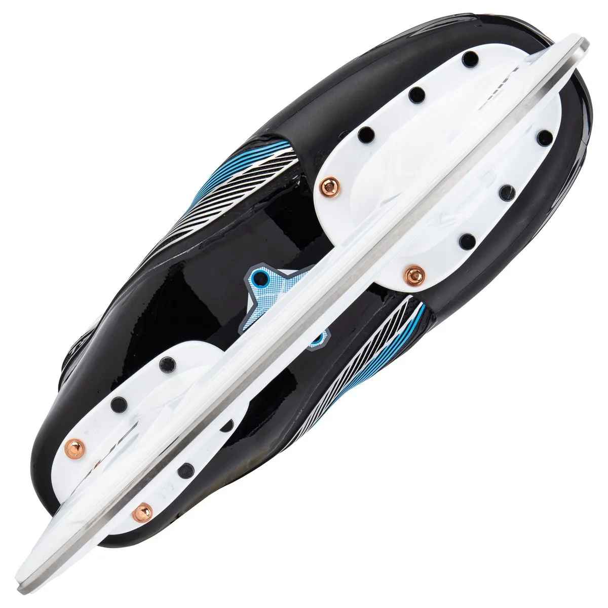 Внешний материал конька выполнен по технологии TRUESHELL и представляет собой монолитный ботинок, из углеродного волокна который после термоформовки обеспечивает лучшую в своем классе посадку. Так же TRUESHELL защищает мыс конька обеспечивая превосходную защиту. Коньки имеют анатомический войлочный язычок, который обеспечивает повышенный комфорт, а вставка из плотной пены обеспечивает дополнительную защиту. Внутренняя подкладка с антибактериальной пропиткой и системой отведения влаги позволяет вашим ногам оставаться сухими во время игры. В коньках так же предусмотрена система персональной подгонки конька PFS которая предусматривает возможность добавления в стельку вставки подходящей для низкого, среднего или высокого свода стопы. В коньках используется стакан SHIFT с системой BENCHCHANGE, позволяющей быстрее заменять лезвие. Так же в коньках установлены лезвия из нержавеющей стали, которая отлично держит заточку.