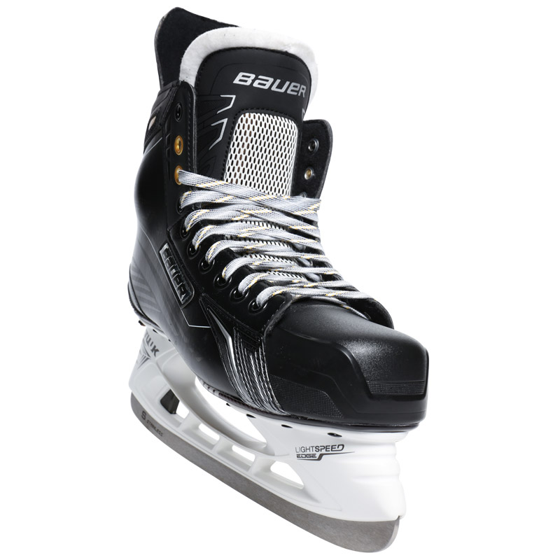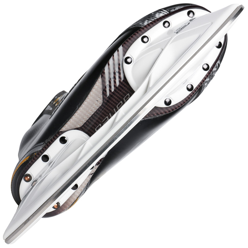 Коньки BAUER SUPREME 160 полупрофессиональная модель в линейке SUPREME 2014 года. Внешняя часть ботинок изготовлена из прочного, углеродного волокна в соответствии с технологией TrueForm Tech PU, которое отличается высокой прочностью, создает эффективную поддержку и усиленную защиту ног. Ботинок термоформируемый, что дает игроку по-настоящему индивидуальную, комфортную посадку. Внутренняя износостойкая подкладка, изготовленная из гидрофобной микрофибры, обеспечивает хорошую теплоизоляцию и способствует отводу влаги. Мягкие вкладки из пены Anaform Fit вокруг щиколотки плотно фиксируют голеностопный сустав, придавая ногам дополнительную устойчивость при динамичном движении. Внутренняя стелька из специализированной пены Fit EVA с интегрированной пяточной чашей создает удобное положение стопы в коньках и обладает хорошими теплоизоляционными и амортизирующими свойствами. Задняя часть ботинка дополнительно усилена внешней, жесткой вставкой для плотной фиксации пятки и эффективной защиты голеностопного сустава и ахиллесова сухожилия от травм. Внутренний, двухсоставной язычок имеет внутреннюю набивку из белого войлока плотностью 40 oz, удобно облегает переднюю часть голеностопного сустава, надежно фиксирует ногу и препятствует пережиму голени шнуровкой. Подошва из сублимированной, термопластичной резины обладает высокой отзывчивостью, хорошей теплоизоляцией и низким весом. Коньки укомплектованы новыми стаканами Tuuk LightSpeed Edge Holder, которые на 3мм выше в задней и передней части, что обеспечивает более резкий, агрессивный разворот игрока. Лезвия выполнены из нержавеющей стали.