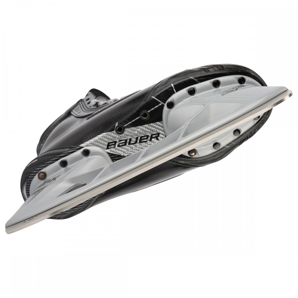 Коньки BAUER SUPREME 1S LE, лимитированая модель в линейке SUPREME 2016 года. Конёк точно повторяет анатомические изгибы стопы и обеспечивает меньшее негативное пространство внутри, в результате конёк имеет плотную, комфортную посадку еще до процесса термоформовки. Ботинок производится из новейшего, композитного материала 3D-lasted Titanium Curv, который значительно снижает вес коньков, обеспечивает повышенную прочность и жесткость. Данный материал пластичен и после процедуры термоформовки ботинки получают комфортную, плотную, индивидуальную посадку. Коньки получили новый суппорт голеностопа Curv Composite, который способствует снижению веса, повышает жесткость и плотно охватывает ногу в области голеностопного сустава. Задник ботинка, защищающий ахиллово сухожилие, выполнен по технологии C-Flex и имеет вставки с различным уровнем жесткости, которые позволяют получить три разных уровня жесткости – отсутствие вставки обеспечивает максимальную гибкость и наибольший диапазон движения, вставка Mid обеспечивает традиционную жесткость и более жесткая вставка Stiff обеспечивает дополнительное сопротивление. Ботинок имеет встроенную, стабилизирующую систему шнуровки Stability Lacing System, ее цельная конструкция позволяет плотнее прижать стопу в нижней части ботинка, уменьшает вес и повышает прочность. Люверсы имеют стабилизирующую, Т-образную форму, что исключает необходимость перешнуровывания ботинка во время игры и позволяет сохранить усилие затяжки. Накладки в верхней части ботинок Total Edge Comfort исключают травмирование мягких тканей ноги верхним краем ботинка при агрессивном катании, обеспечивая необходимый комфорт. Обивка в области голеностопного сустава выполнена из легкой пены с эффектом памяти и позволяет убрать свободное пространство внутри ботинка, плотно фиксируя стопу. Язычок так же выполнен с применением технологии C-Flex и имеет вставки с различным уровнем жесткости, которые выполняют защитную функцию и позволяют увеличить диапазон движения и мощность шага. Внутренняя стелька Speed Plate выполнена из пластичного материала и после термоформовки повторяет контур стопы, придает шагу пружинистость, способствует повышению передачи энергии при каждом шаге. Гидрофобный материал с технологией 37.5 используется в качестве внутренней подкладки. Данный материал позволяет использовать тепло тела для быстрого испарения влаги, обеспечивая быстрый отвод тепла и влаги от ноги и создавая исключительный уровень комфорта. На коньках стоят стаканы Tuuk LightSpeed Edge, которые выше на 3 мм, чем традиционные стаканы, что позволило увеличить угол атаки и уменьшить радиус разворота и, как результат, улучшить маневренность игрока. В данной модели установлены профессиональные лезвия из нержавеющей стали Tuuk LightSpeed LS4, имеющие улучшенную отделку поверхности, что обеспечивает более острый край и лезвия лучше держат заточку.