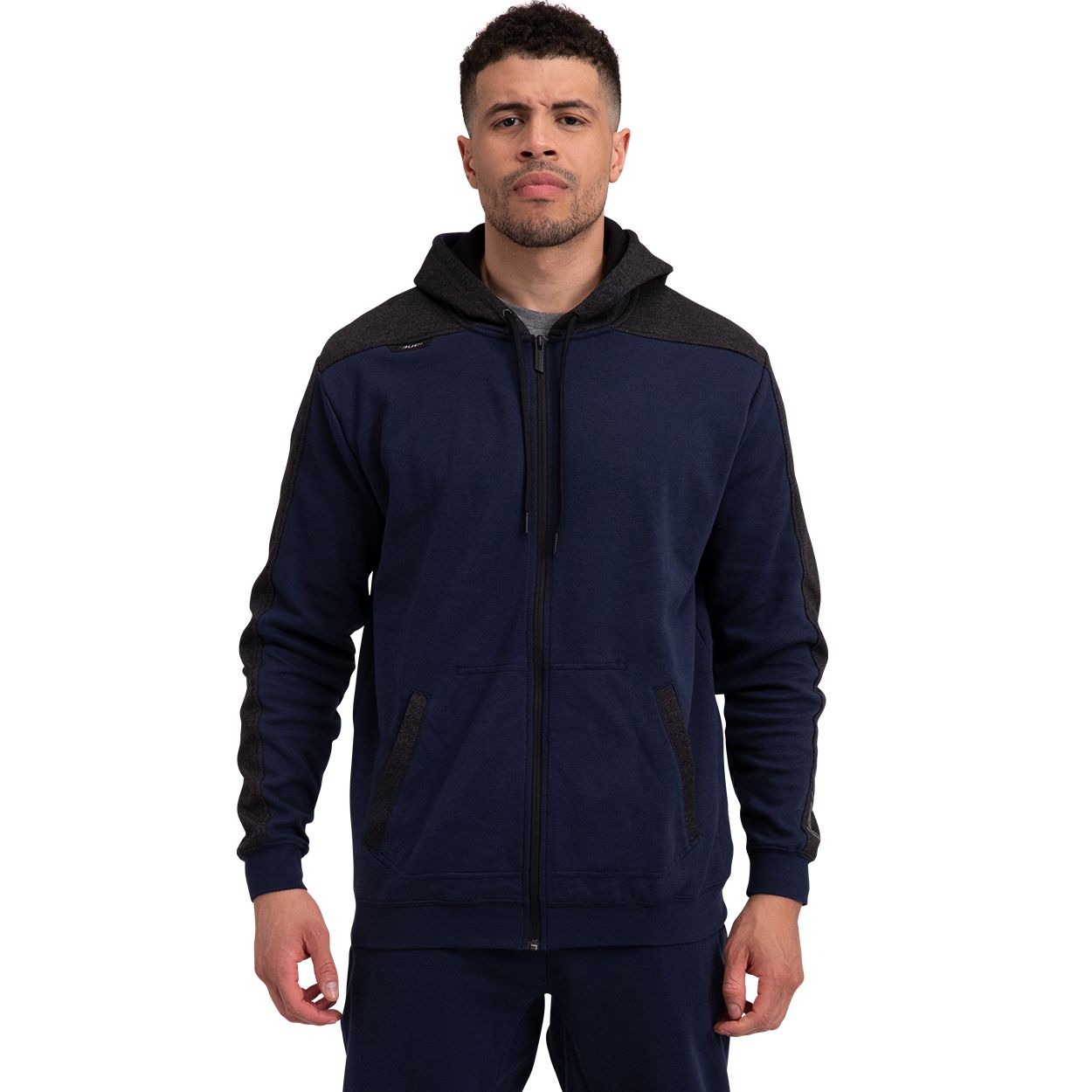Данная модель имеет зауженную посадку. Костюм выполнен из материалов хлопок (67%) и полиэстер (33%). Толстовка имеет высокую горловину с высококачественным замком YKK®. Так же толстовка имеет два боковых кармана. Нижний край и рукава толстовки имеют мягкую, эластичную резинку для большего комфорта. Брюки данной модели имеют высококачественный замок YKK®. Так же брюки имеют два боковых кармана и эластичный пояс со шнурком.