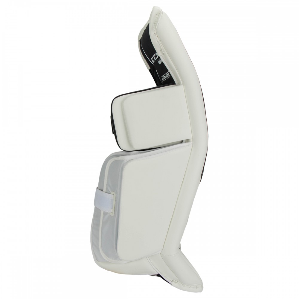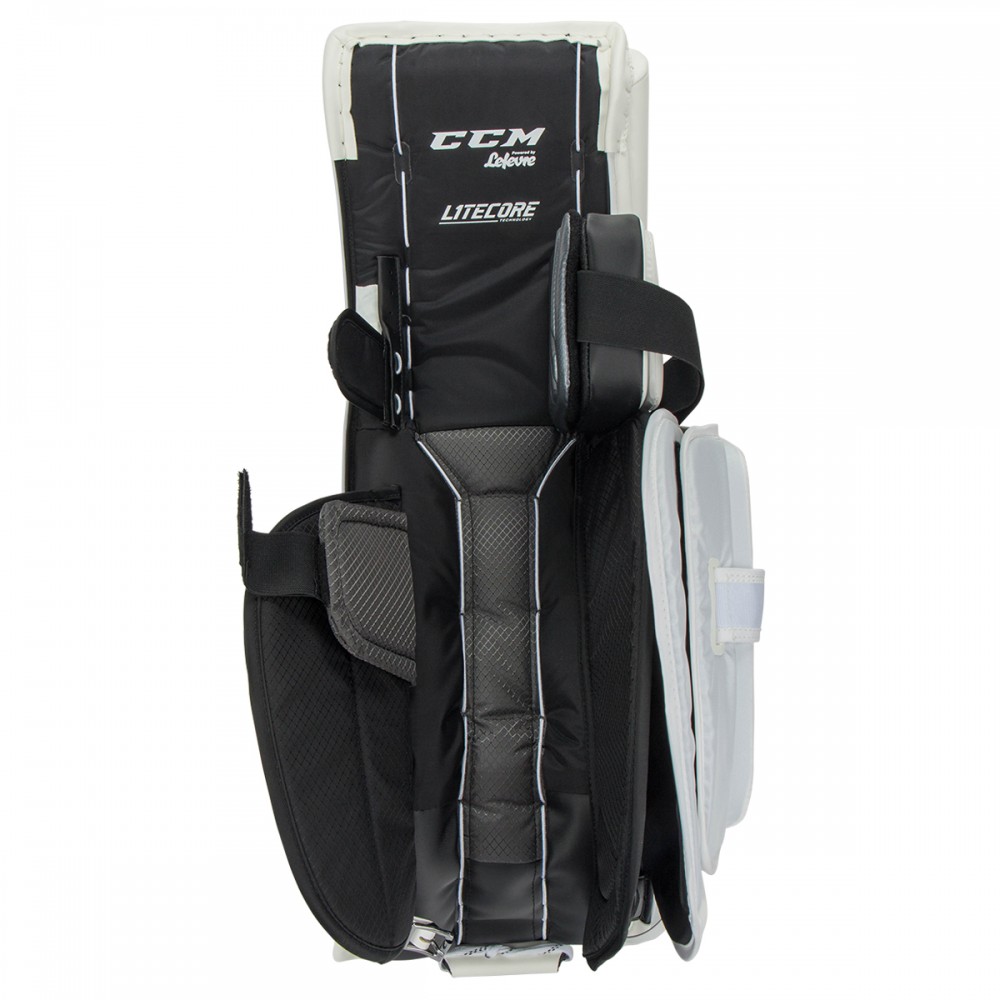Внешний материал щитков SPEEDSKIN, который лучше скользит по льду. Внутренняя конструкция щитков выполнена по новой технологии LITECORE, благодаря вес снизился на 20%, чем предыдущая коллекция и улучшен отскок шайбы во время игры. Так же в этих щитках изменена нижняя часть, закрывающая конек, теперь вратарю будет проще отталкиваться ото льда, стоя на коленях. С обратной стороны щитки оснащены эластичными ремешками STRAP SYSTEM, благодаря чему вратарю проще садиться в бабочку и вставать на ноги.