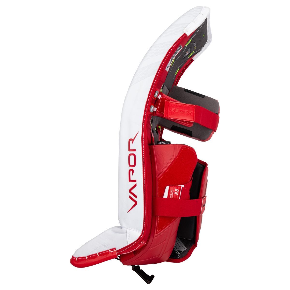Внешняя часть щитка выполнена из нового материала C.O.R TECH PLUS. Этот материал представляет собой очень прочную синтетическую кожу, которая помогает улучшить отскок, а также придает щиткам прочность и долговечность. Внутри используется пена REBOUND BOOST CORE в сочетании с композитным материалом CURV с изгибом в области бедра которая придает щитку прочную, но гибкую конструкцию. Для уменьшения веса, а также лучшего скольжения щитки имеют тонкий боковой профиль. Внизу щитка у ботинка используется технология FREE-FLEX 110 DEGREE BOOT которая имеет угол изгиба на 10 градусов больше, чем предыдущих щитках линейки VAPOR, благодаря этому повышается гибкость щитка и улучшается посадка в области стопы. Щитки оснащены новым жестким коленным блоком STABILFLEX. Внутренняя подкладка имеет отличную воздухопроницаемость для быстрого высыхания щитка. В щитках используется система креплений TUNE FIT 2.0, которая обеспечивает комфортную посадку и оптимальный баланс