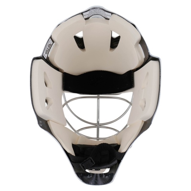 Шлем выполнен из кевлара, стекловолокна и карбона — это легкая и прочная конструкция. Большой проем обеспечивает хорошую видимость, а традиционная пена удобна и защищает от мощных бросков. В шлеме используется прочная маска из нержавеющей стали. На задней части шлема присутствуют 5 ремней которые позволяют вратарю отрегулировать посадку шлема. С полным ассортиментом товаров вы можете ознакомиться в нашем каталоге: https://worldhockey.market/catalog/