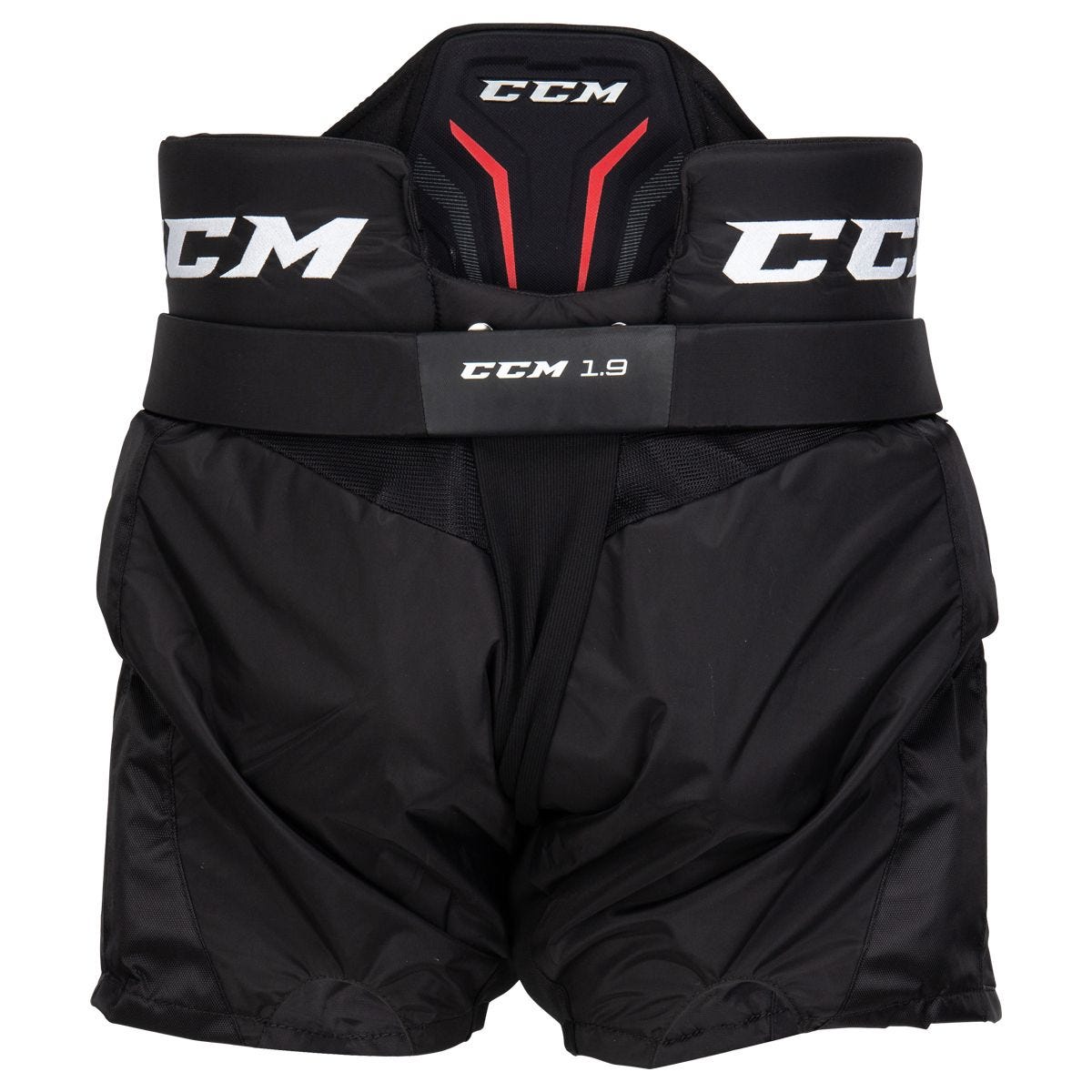 В стратегических зонах имеются эластичные вставки, которые добавляют вратарю мобильности. Вместе с максимальной подвижностью, верхний борт позволяет легко заправлять наплечник в трусы для более плотного прилегания. Новинкой в трусах CCM 1.9 является новая система внутреннего ремня Fit+. Внутренний ремень имеет больше мягкой набивки и новые застежки для комфортного использования, кроме того позволяет вратарю полностью отрегулировать трусы под свой стиль игры. Так же на трусах присутствует система регулировки по длине на 1 дюйм (2,5см) На бедрах используется гибкую конструкцию с сегментированной полиэтиленовой пеной для максимальной гибкости. На передних тазобедренных пластинах используется формованный пластик с пенополиуретаном для защиты от мощных бросков. Для защиты позвоночника используется формованная пена EVA с сегментированной конструкцией, поэтому вратарь отлично защищен, но при этом не теряет в мобильности. Чехол трусов изготовлен из нейлона плотностью 400D и имеет эластичные вставки, все это позволяет трусам быть надежными и мобильными.