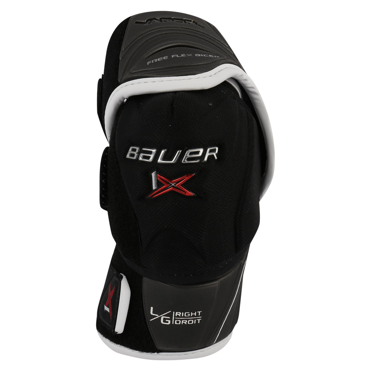 Налокотники BAUER VAPOR 1X топовая модель в линейке Vapor, новинка 2016 года обладает легкой и подвижной конструкцией, обеспечивая высокий уровень защиты полевого игрока. Налокотники имеют трехсоставную конструкцию Free Flex, которая позволяет элементам защиты бицепса, предплечья и локтевой чаше двигаться гибко и свободно друг от друга во всех направлениях. Элемент защиты бицепса имеет сегментированное строение и навесную конструкцию. В качестве внутреннего наполнения в элементах защиты бицепса используется легкая пена Aerolite, которая покрывает пластиковые вкладыши, эффективно защищая верхнюю часть руки игрока. Встроенная, локтевая чаша из формованного пластика покрыта пеной средней плотности, как с внутренней, так и с наружной стороны, образуя эффективную, двухстороннюю защиту для игрока. Внутреннее отверстие для локтевого сустава в локтевой чаше комфортно фиксирует локтевой сустав, исключая его смещение. Элемент защиты предплечья выполнен из композитного материала Curv и дополнен пеной Aerolite, которая на 30% легче стандартной пены высокой плотности, но обладает такими же высокими защитными свойствами, не впитывает влагу. Такое сочетание позволяет облегчить защитное снаряжение и обеспечить максимально высокий уровень защиты. В качестве внутренней подкладки используется гидрофобный, сетчатый материал с технологией 37.5, которая позволяет использовать тепло тела для быстрого испарения влаги. Локтевая чаша дополнительно покрыта с внутренней стороны сеткой, которая обладает хорошей воздухопроницаемостью и усиливает действие технологии 37.5, а так же обеспечивает исключительный уровень комфорт. Налокотники фиксируются на руках с помощью трех ремней крепления. Эластичный ремень шириной 2" (5 см) фиксирует элемент защиты предплечья. Эластичный ремень шириной 2" (5 см) фиксирует элемент защиты на бицепсе. Ремень из эластичной сетки Y-образной формы фиксирует локтевую чашу на сгибе локтя.